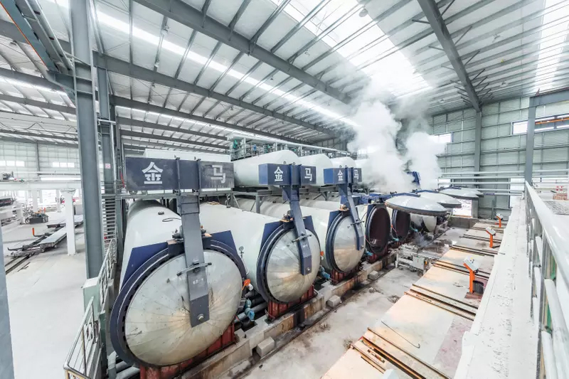 العجينة المقطوعة أكملت المعالجة الحرارية المائية CAo-Si02-H2O في الأوتوكلاف، عمليات المعالجة متمثلة في أربع مراحل، التفريغ الهوائي – التسخين – درجة الحرارة الثابتة – التبريد، والمنتج النهائي. في النهاية، إنتاج كتل أو الألواح الخرسانة الخلوية الخفيفة AAC.
